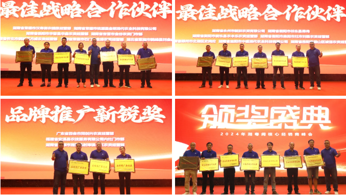 大會頒發(fā)了“最佳戰(zhàn)略合作伙伴”和“品牌推廣新銳獎”,來自湘粵閩的21位優(yōu)秀經銷商榮獲最佳戰(zhàn)略合作伙伴稱號。優(yōu)秀經銷商代表湖南省湘西州吉首市金谷農資經營部楊葉英、廣東省清遠市飛鳴生態(tài)農業(yè)發(fā)展有限公司何飛明分別上臺發(fā)言。