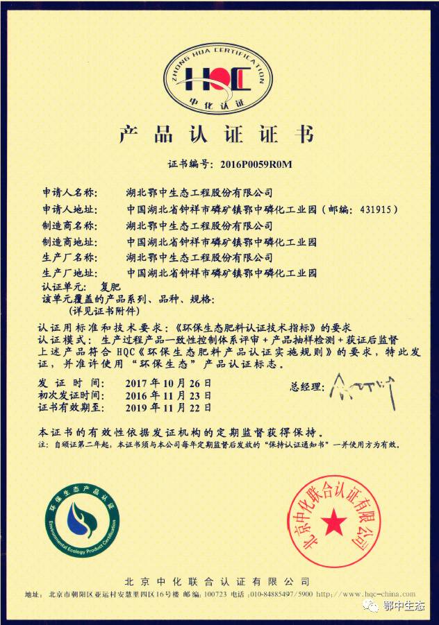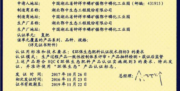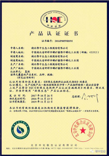 ?????? 專家組經(jīng)過綜合評審結(jié)論為,鄂中生態(tài)生產(chǎn)設(shè)備先進、技術(shù)工藝嚴謹,產(chǎn)品質(zhì)量可靠,復合肥料生產(chǎn)全過程均對有害物質(zhì)實施了有效控制,符合HQC《環(huán)保生態(tài)肥料產(chǎn)品認證實施規(guī)則》的要求。在對產(chǎn)品進行了抽樣封存,樣品寄到國家化肥質(zhì)檢中心檢測中,各項重金屬及縮二脲指標均為合格。符合國家環(huán)保生態(tài)肥料產(chǎn)品的標準和要求,決定通過其環(huán)保生態(tài)肥料產(chǎn)品的認證審核,授予其“國家環(huán)保生態(tài)肥料產(chǎn)品認證企業(yè)”稱號。至此,鄂中生態(tài)已經(jīng)連續(xù)二年通過該項認證。