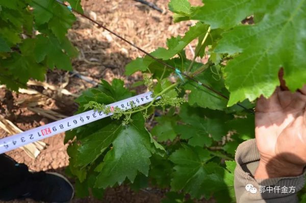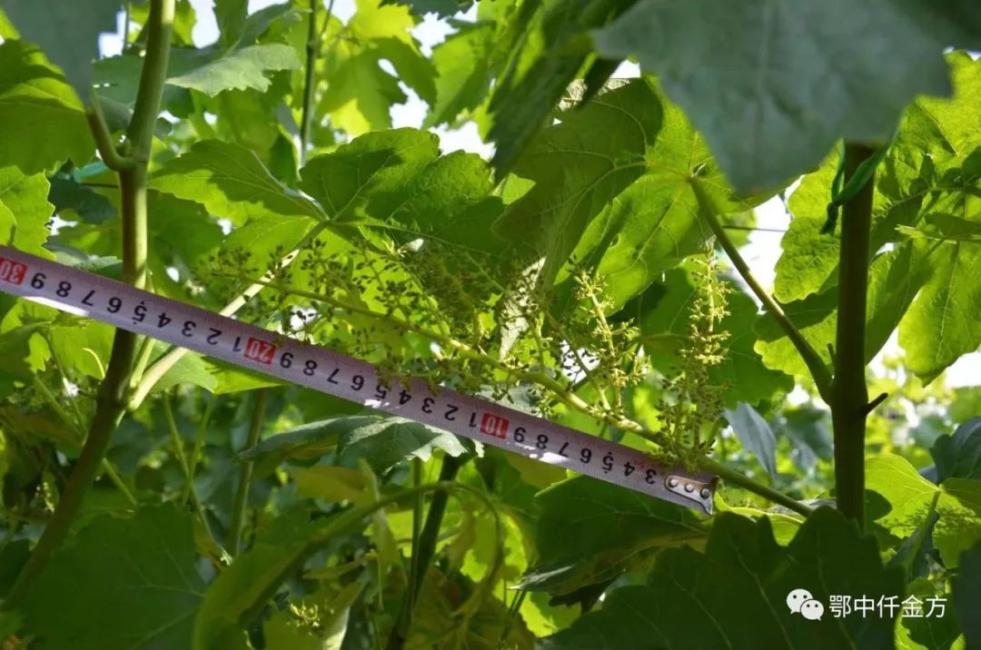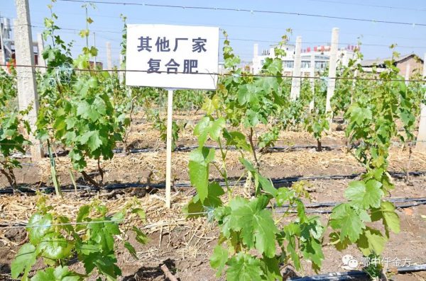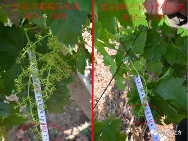 花序:花前芽孢飽滿,發(fā)芽齊,芽壯,首次發(fā)芽率和開(kāi)花率達(dá)到90%以上,示范田花序23cm,直立挺拔,花蕾多,多數(shù)處于坐果期;對(duì)照田花序14cm,部分彎曲,花蕾少20%,多數(shù)處于開(kāi)花前期;示范田每株葡萄比對(duì)照田多1-2個(gè)花序,預(yù)測(cè)示范田產(chǎn)量要比對(duì)照田每畝產(chǎn)量多800-1500斤,證明仟金方18-10-14可以使葡萄增產(chǎn)20%-30%。
