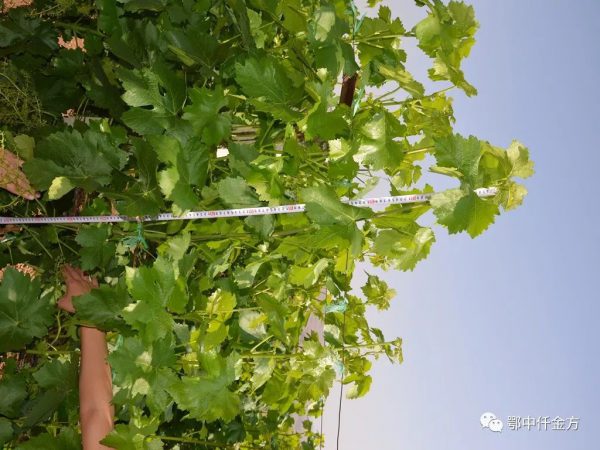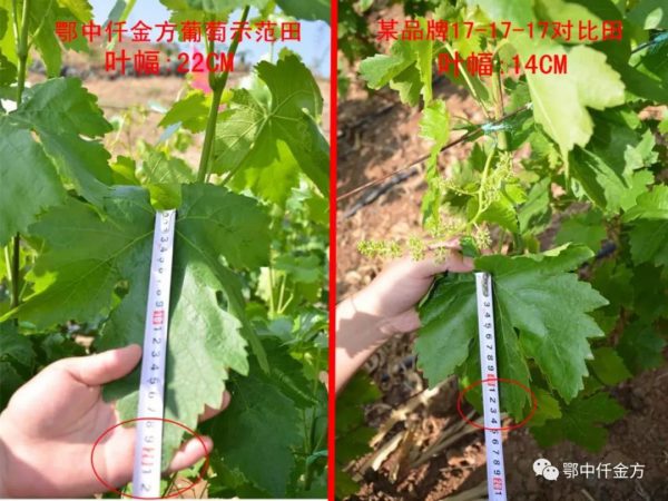 枝梢:示范田新稍長(zhǎng)130cm,粗壯挺拔,張開(kāi)角度適中,采光光合作用增強(qiáng);對(duì)照田新稍長(zhǎng)度104cm,多數(shù)細(xì)弱柔軟不成熟,張開(kāi)角度過(guò)大不利于采光;示范田每株新稍數(shù)量是對(duì)照田的1.5-2倍,由此可預(yù)測(cè)示范田光合養(yǎng)分供應(yīng)要比對(duì)照田強(qiáng)2倍,證明仟金方18-10-14在促進(jìn)葡萄抽新稍及生長(zhǎng)成熟上有明顯效果。