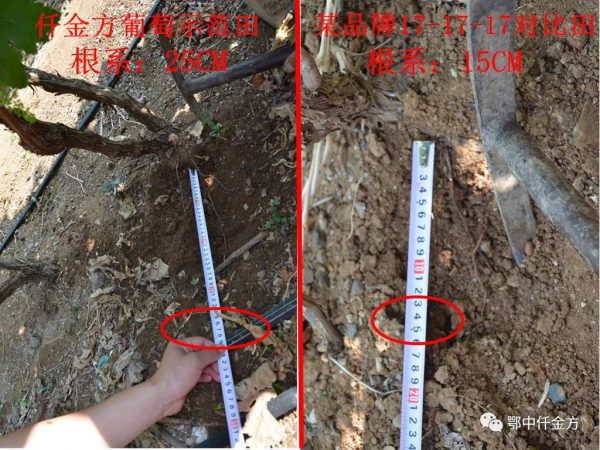 根系:樹體健康強(qiáng)壯,示范田根系長(zhǎng)度達(dá)25cm,土壤蓬松,根系旺盛須根多,養(yǎng)分吸收多,植株抗逆性強(qiáng),延緩了植株衰弱期,沒(méi)有脫肥現(xiàn)象;對(duì)照田根系長(zhǎng)度14cm,須根較少,土壤鹽化明顯,大面積板結(jié),預(yù)測(cè)示范田根系比對(duì)照田吸水吸肥能力強(qiáng)80%,證明仟金方18-10-14能改良蓬松土壤,減輕鹽化,促進(jìn)根系生長(zhǎng)發(fā)達(dá),提高化肥利用率,真正起到減肥增效的功效。