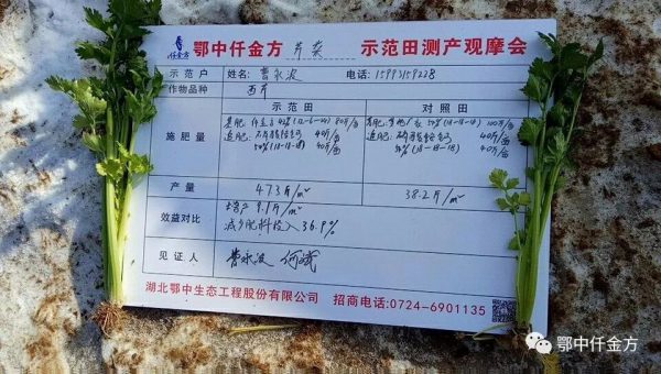 芹菜(西芹)測(cè)產(chǎn)結(jié)果:選取鄂中仟金方42%(12-6-24)和對(duì)照田其它廠(chǎng)家復(fù)合肥54%(18-18-18)中間區(qū)域西芹進(jìn)行隨機(jī)取樣,選取3組,每組0.5平方米,觀(guān)摩會(huì)新型職業(yè)菜農(nóng)現(xiàn)場(chǎng)監(jiān)督取樣,鄂中仟金方中醫(yī)養(yǎng)護(hù)隊(duì)員和示范戶(hù)親自采收,保證采收程度相同,采收136株,3組綜合測(cè)產(chǎn),仟金方區(qū)域47.3斤,對(duì)照區(qū)域38.2斤,增產(chǎn)9.1斤,畝增產(chǎn)4040.4斤。折除水分測(cè)算,平均畝增產(chǎn)3401.7斤。按70%商品計(jì)算為2381.2斤,按當(dāng)前批發(fā)價(jià)0.8元每斤,畝增收1904.96元。減少肥料投入36.9%,示范田減少農(nóng)藥及人工投入兩次,平均畝節(jié)本95元,畝節(jié)本增效1999.96元,鄂中仟金方施用減肥增效明顯。
