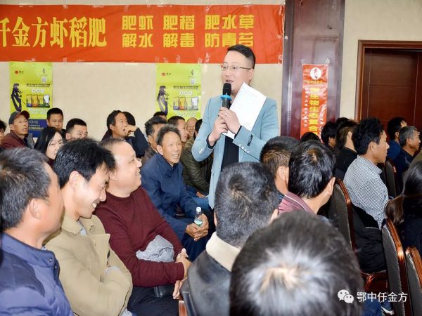 做會(huì)議營(yíng)銷就要做技術(shù)品牌!2018年4月13日,西南大區(qū)總經(jīng)理杜水清、鄂西分公司經(jīng)理田興率鄂西營(yíng)銷精英、鄂中經(jīng)銷商、直銷商、零售商攜種植大戶330余人在湖北荊門沙洋召開(kāi)了一場(chǎng)會(huì)銷變革會(huì)議。一改過(guò)去靠促銷、政策來(lái)吸引渠道商和種養(yǎng)戶的會(huì)議模式,而是通過(guò)技術(shù)服務(wù)、交流以達(dá)到為蝦稻養(yǎng)殖戶增值增收的創(chuàng)新會(huì)議模式,得到了廣大渠道商和種養(yǎng)戶的認(rèn)可與稱贊。整場(chǎng)會(huì)議熱鬧非凡,以技術(shù)培訓(xùn)交流、文藝助演、知識(shí)問(wèn)答、禮品贈(zèng)送等推動(dòng)鄂中仟金方蝦稻套餐肥(19-5-8)成功訂貨201.5噸。