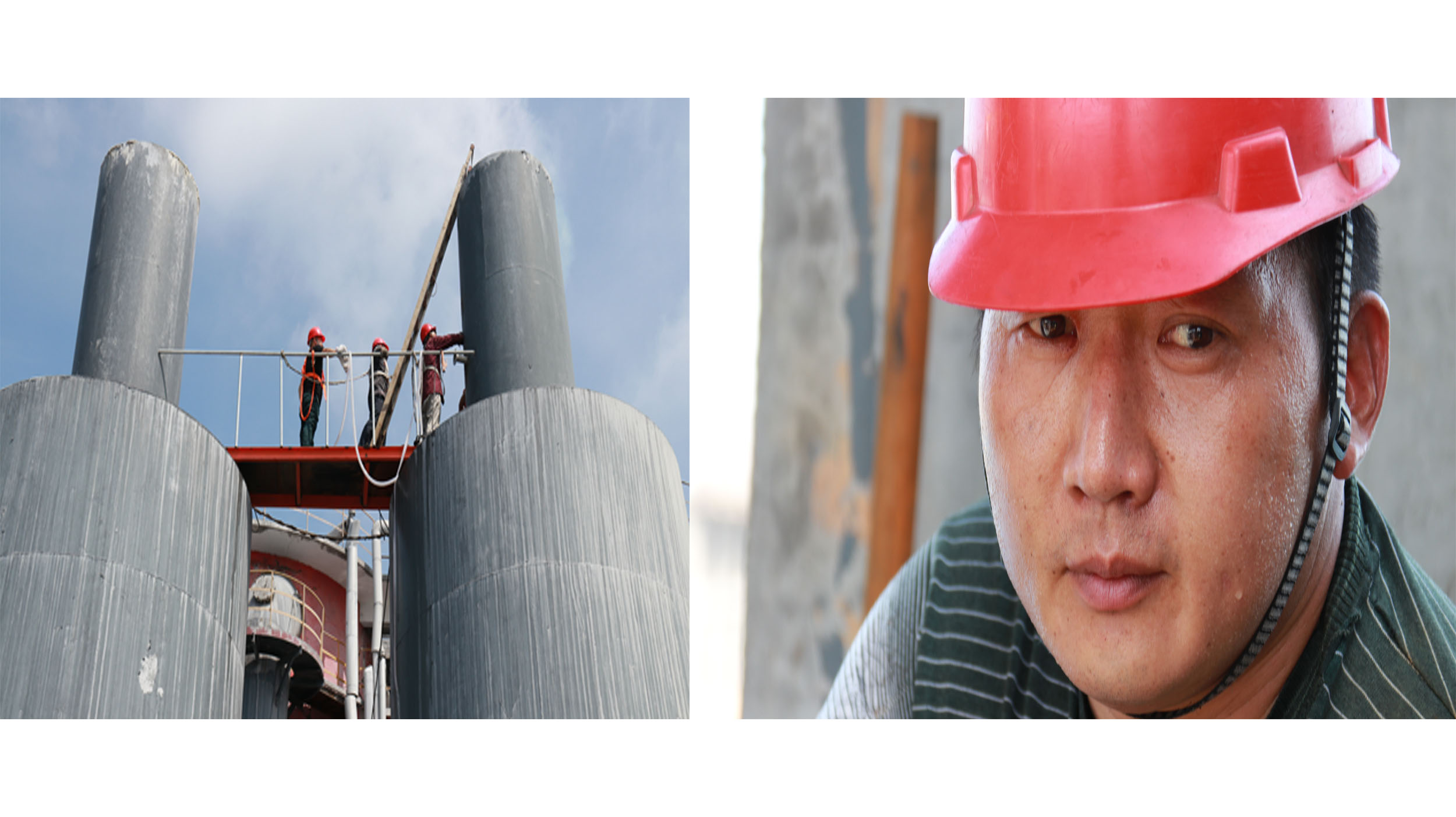總部磷銨廠噴粉塔內(nèi)溫度高達80多攝氏度,塔內(nèi)異常悶熱。為保證正常生產(chǎn),該廠每2-3天都會用80多度的高溫?zé)崴畬λ?、床層進行清洗。圖為該廠一生產(chǎn)班班長在塔內(nèi)清洗作業(yè)。
