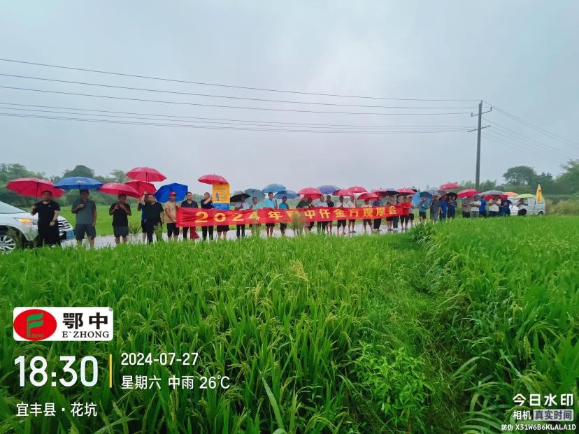 7月27日,江西分公司攜手宜豐縣西門農(nóng)資,在芳溪鎮(zhèn)花坑村舉辦了一場鄂中仟金方水稻示范觀摩會,來自當(dāng)?shù)匾约案甙彩?、上高縣的150余名種植戶參加了觀摩活動。