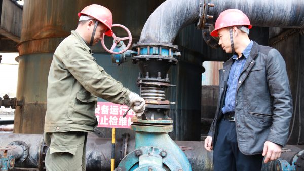 宜昌公司副經(jīng)理王雪峰(左)與總工彭亮(中)、磷銨廠廠長(zhǎng)蔣慶元在磷銨廠現(xiàn)場(chǎng)商討技改方案