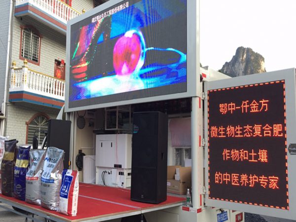 鄂中生態(tài)大型智慧農化音響服務車隊就是流動的農化知識源,豐收的唱響曲。隨車的有一線促銷精英,有豐富經驗和知識的農化師,主持人等。大屏幕可以隨時在田間地頭打開進行演唱式授課;該服務車具備專業(yè)的功能硬件,可以有針對性的開展一系列農化服務。如根據種植作物的不同,結合服務區(qū)域內土壤狀況、肥力情況、作物品種及需肥規(guī)律、農民施肥習慣等展開田間現(xiàn)場培訓指導,提供咨詢服務,滿足農民、種植大戶個性化的需求。